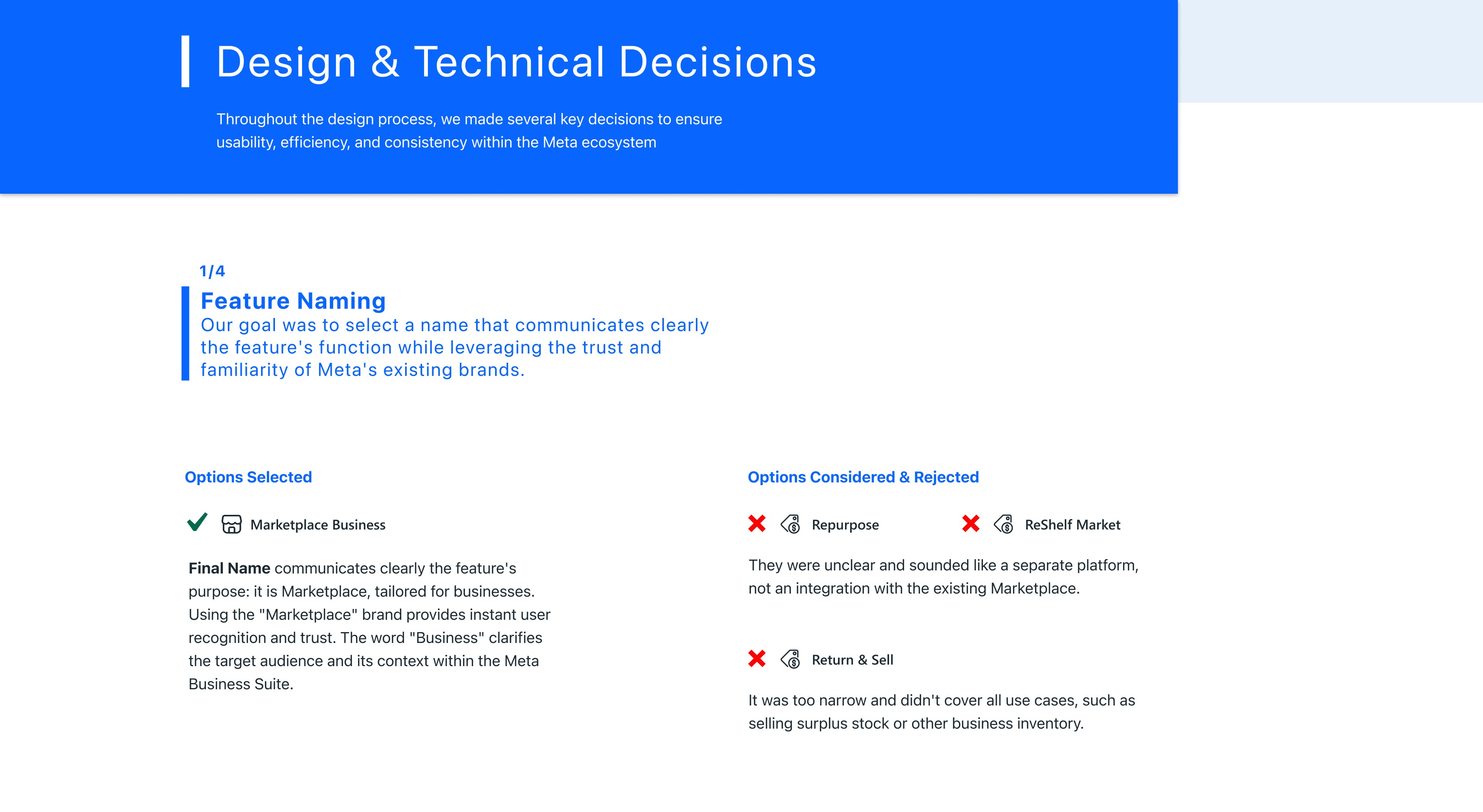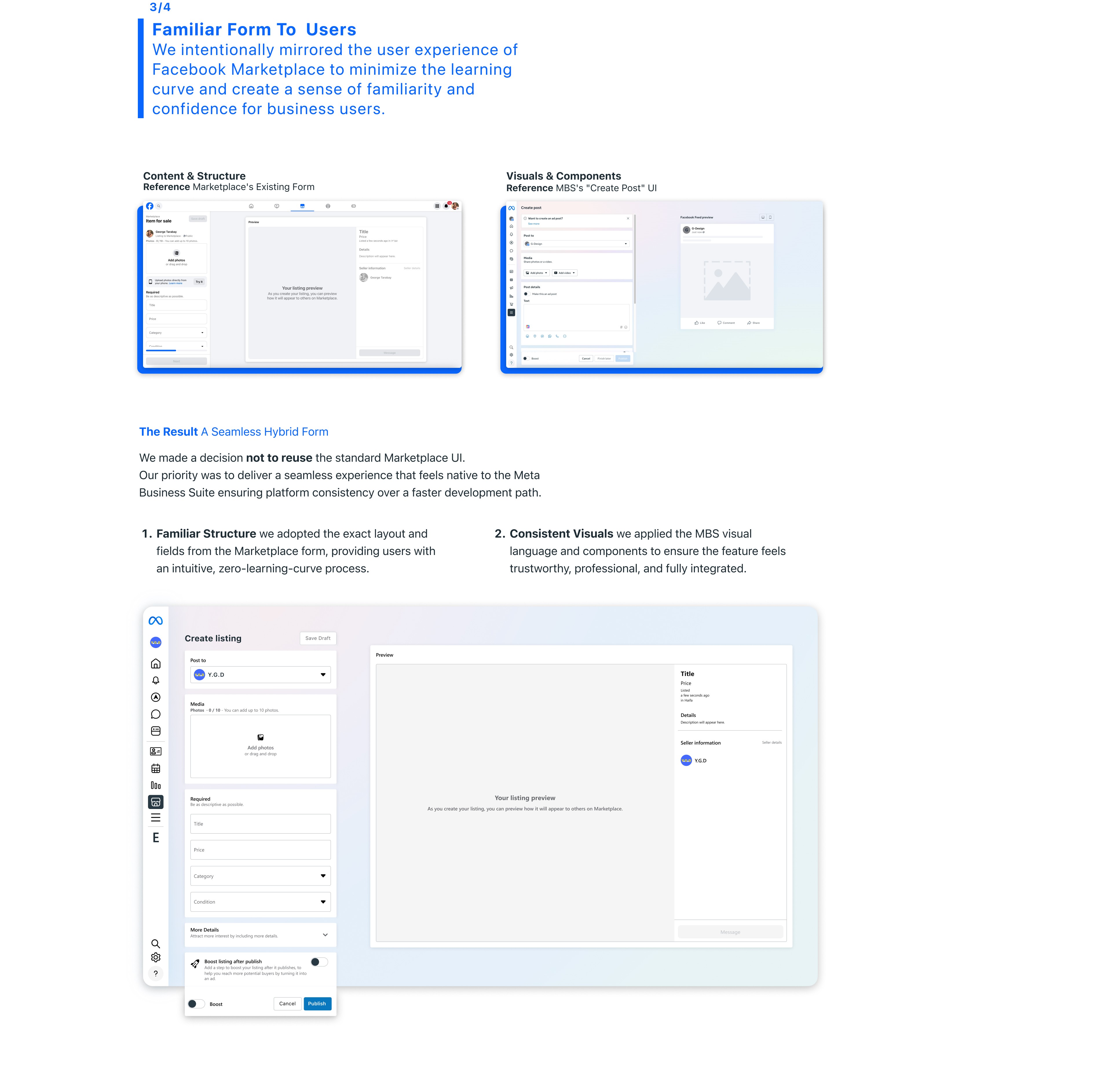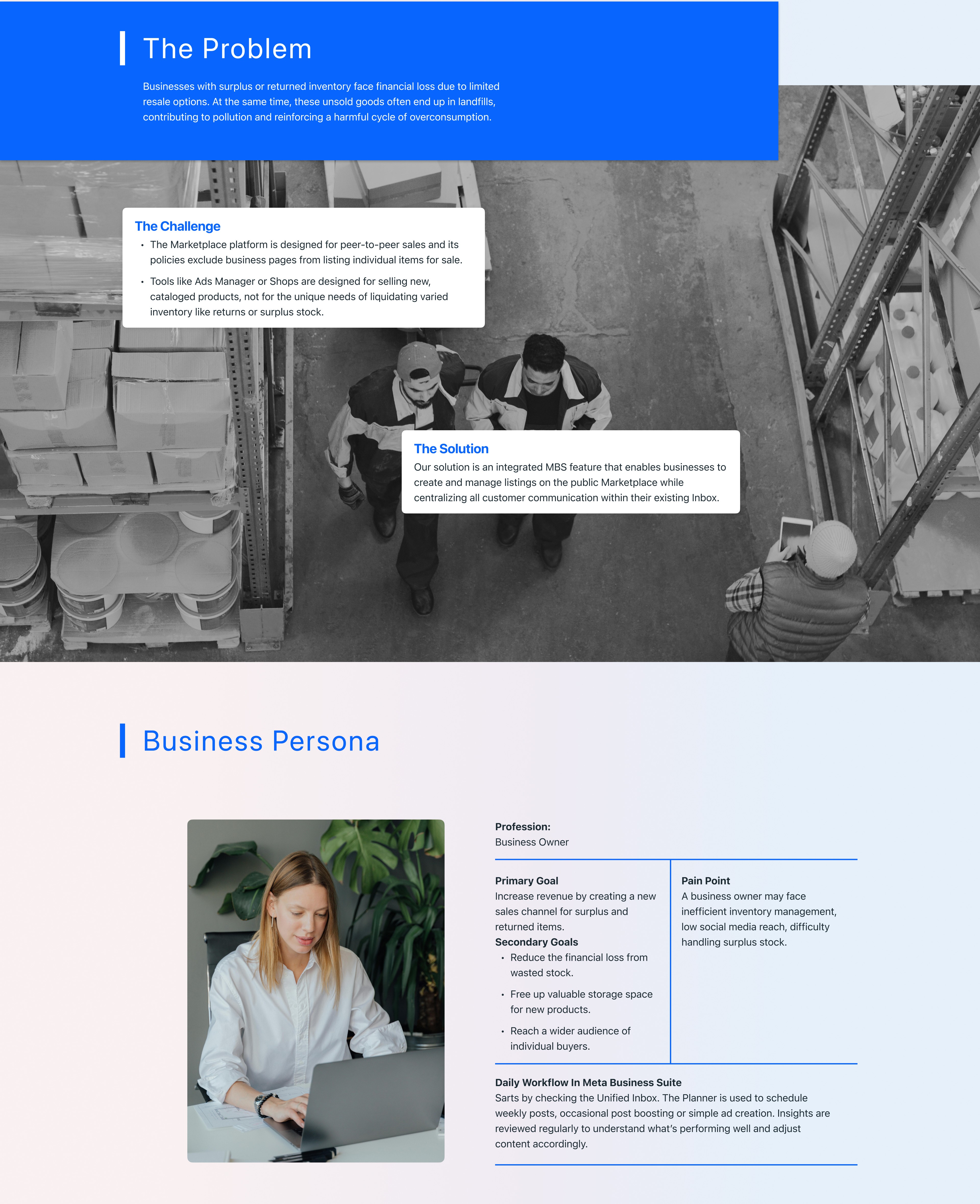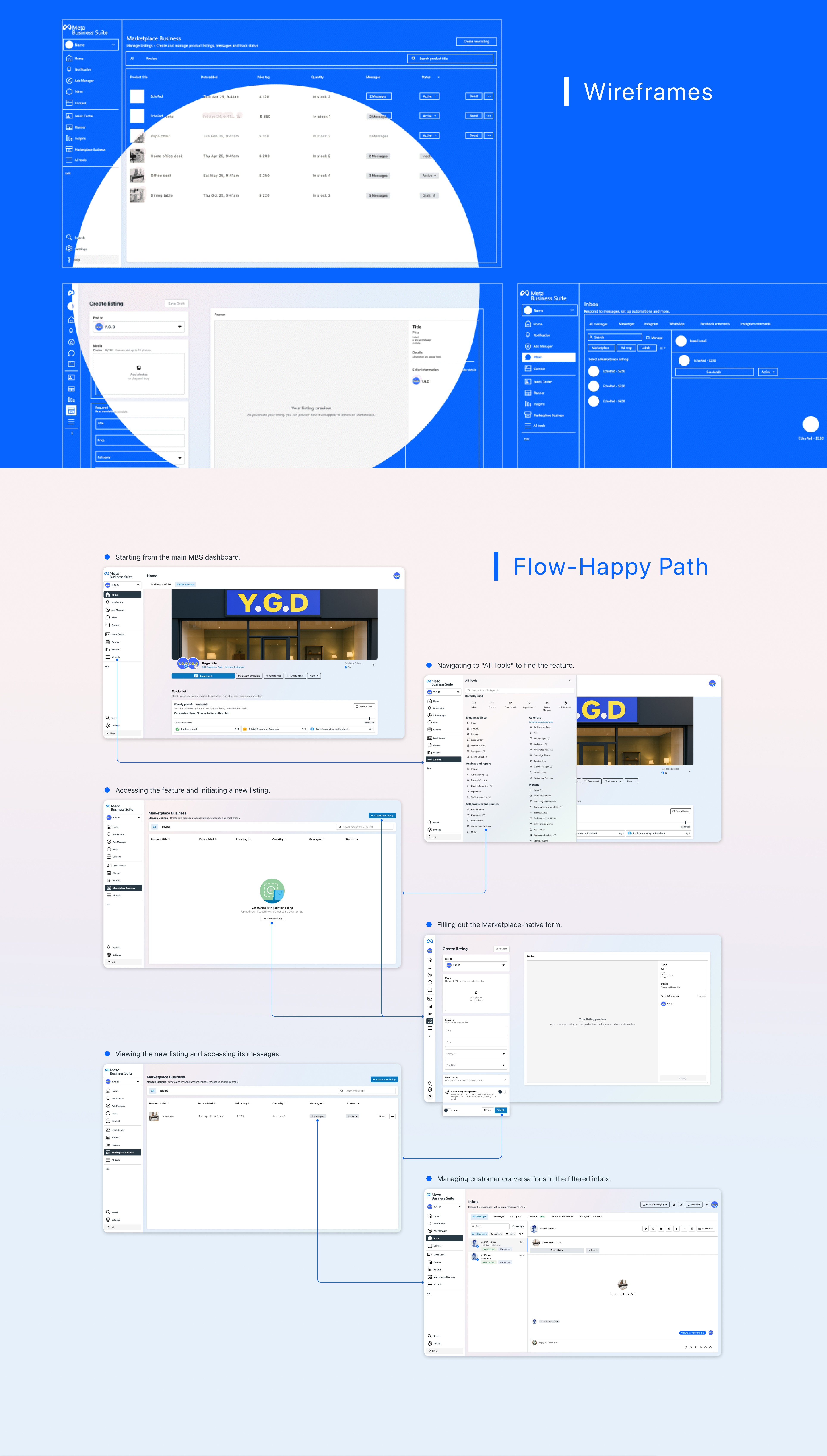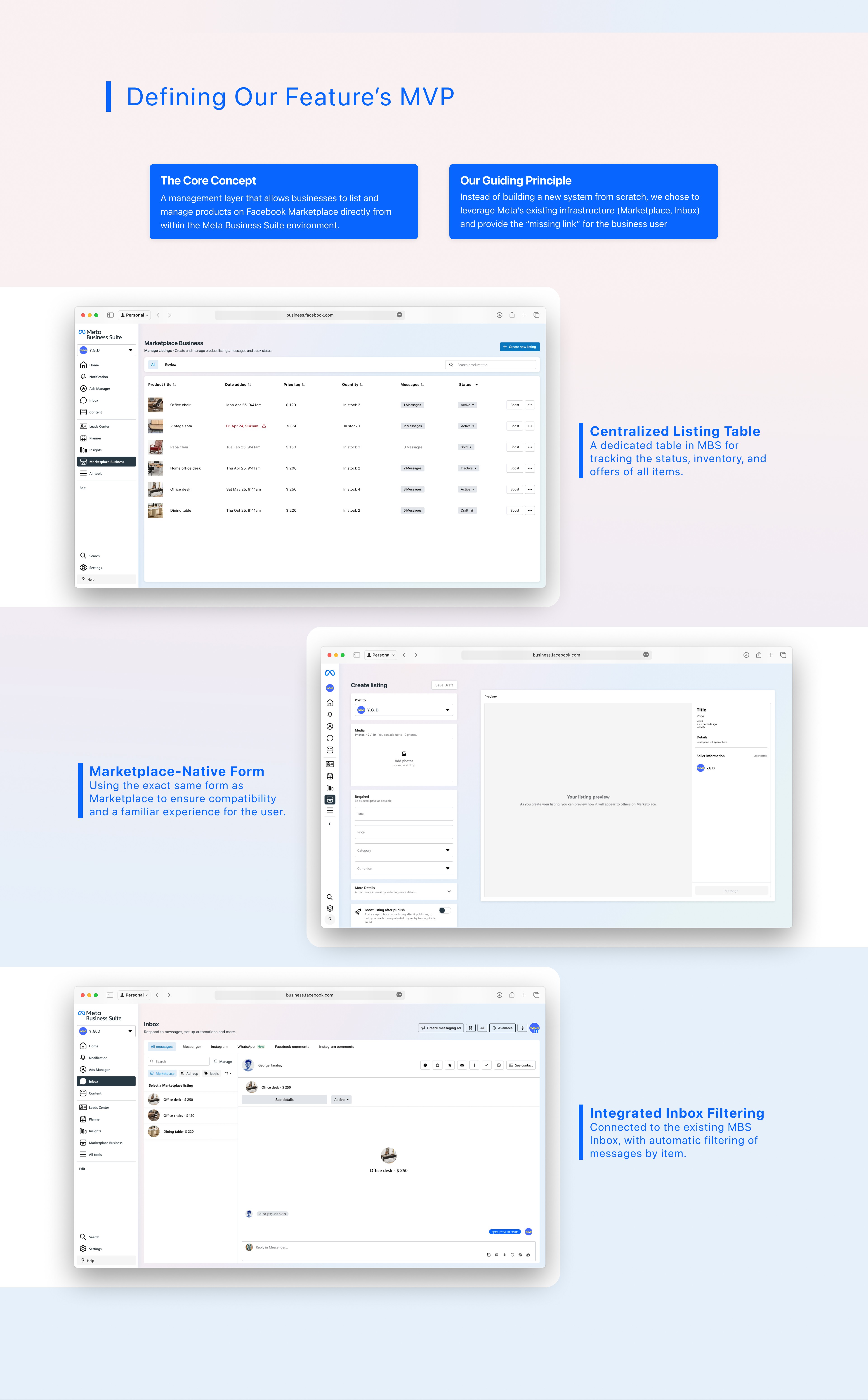 This case study details the design of "Marketplace Business," a new feature integrated into the Meta Business Suite. The goal was to empower businesses by providing a dedicated tool to sell surplus and returned inventory on Facebook Marketplace, bridging a critical gap between B2B needs and the platform's consumer-focused design. The result is an intuitive and seamlessly integrated solution for managing listings and customer communications.